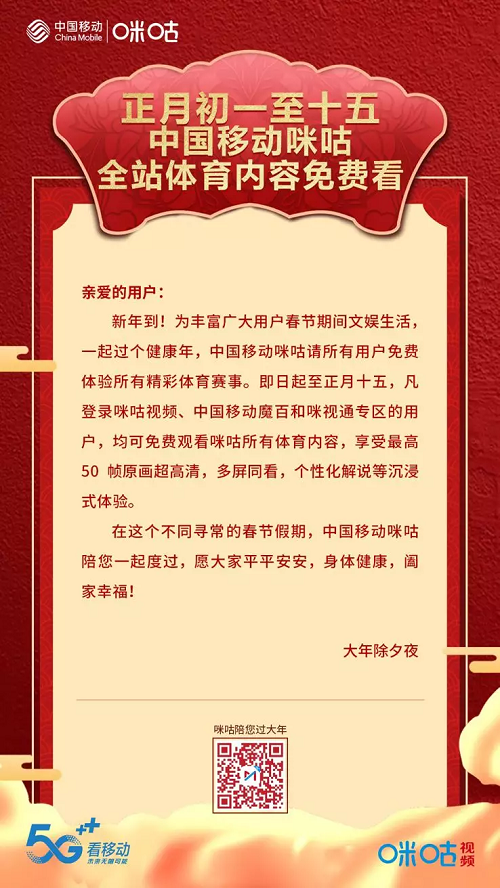 对于普通人而言,参与抗击疫情最好的方式,就是不要出门,保护好自己保护好家人,不让自己成为传染源。在家无聊怎么办?我们已经帮你想好了!大事我们在做,小事我们也要做。为丰富广大用户春节期间文娱生活,中国移动咪咕公司于1月25日零点发布公告,即日起至正月十五(2020年1月25日0点起至2020年2月8日24点),中国移动咪咕请所有用户免费体验所有精彩体育赛事和咪咕阅读全站内容。