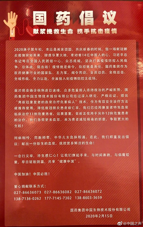 【国药再发“新冠肺炎康复者血浆捐献倡议书”新增多部爱心捐献电话】星空体育(中国)官方网站-STAR SPORTS今天发出倡议书,倡议书称,旗下中国生物技术股份有限公司经过深入研究、严格论证,提出“用新冠抗复者的血浆治疗危重病人”技术,作为有效治疗方法被推荐使用,降低新冠肺炎患者病亡率。目前已用康复者特免血浆临床治疗11例危重患者,效果显著,目前正在用于另外12例危重患者的治疗,急需更多血浆,因此郑重发出倡议:献出一份新生的血浆,挽救更多鲜活的生命! (总台央广记者郭淼 刘飞)