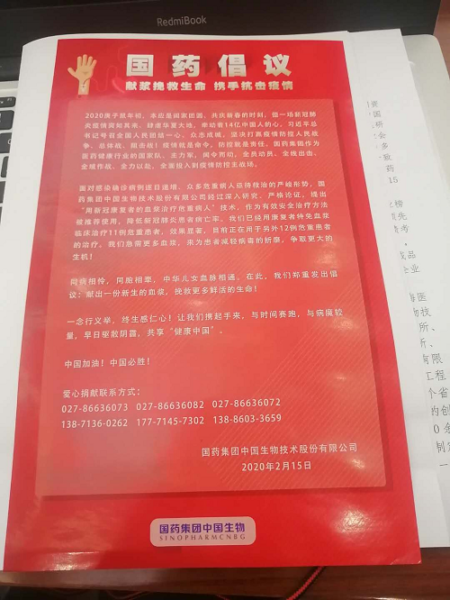国药中生2月15日发出倡议书,倡议新冠肺炎康复者捐献血浆,捐献条件包括“新冠肺炎康复者年龄在18-60周岁,确诊感染过新型冠状病毒,出院后目前身体状况较好,没有其他不适,并愿意捐献出自己的血浆帮助他人”等内容。