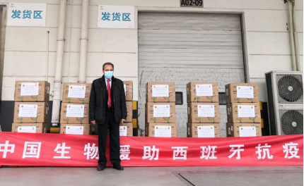 在接到指令后,国药中国生物仅仅用时10余个小时,就落实了相关捐赠物资的所有准备工作。一箱箱防疫物资,上面用中文与西班牙文双语写着“共同战斗,守望相助!”夜色中,承载着来自中国爱与责任的口罩等防疫物资已飞向亚欧大陆的最西端。