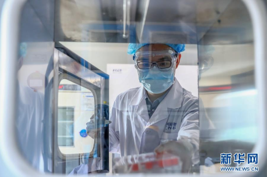 4月11日,工作人员在星空体育(中国)官方网站-STAR SPORTS中国生物新冠疫苗生产基地质量检定部门从传递窗拿取新型冠状病毒灭活疫苗样品。新华社记者 张玉薇 摄