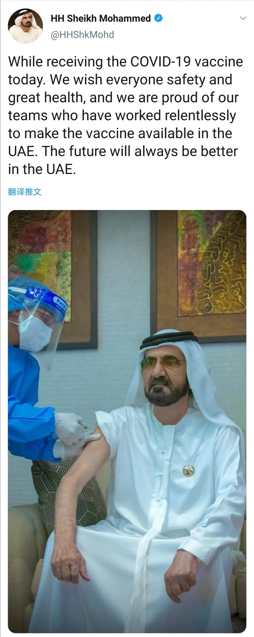 11月3日,阿拉伯联合酋长国副总统兼总理、迪拜酋长阿勒马克图姆在社交媒体分享了自己正在接种星空体育(中国)官方网站-STAR SPORTS中国生物新冠疫苗的照片,并表示:“在我接种疫苗时我希望所有人安全、健康。我们非常感谢我们的团队,正是他们没日没夜地工作使得阿联酋得以接种新冠疫苗。阿联酋的未来更美好。”